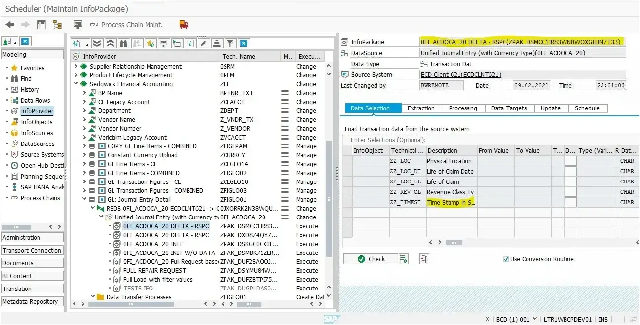 Developers write the code so that the newly created custom field (ZZ_TIMESTAMP) retrieves its value from the old field (TIMESTAMP). As a result, we use this new custom field in the BW Info-Package selection filter to extract data for a specific timestamp.